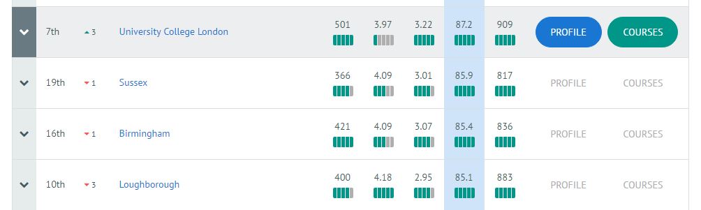 Estaba buscando datos y me he encontrado con esta guía super interesante para los que estáis a la búsqueda de cursos de grado o post-grado en UK. Os indica (en puntos UCAS) las Universidades más exigentes y menos exigentes, y veréis que las perspectivas profesionales y nivel de satisfacción de los alumnos no siempre coinciden con las más exigentes. Así, tenemos a Sussex, Birmingham o Loughborough que no exigen unas notas exageradas y cuyos alumnos tienen magníficas perspectivas profesionales. Echadle un ojo!