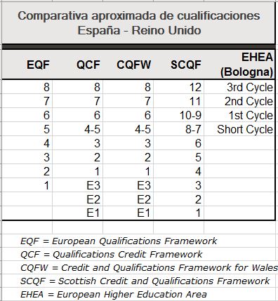 Mientras tanto, aquí os dejo una comparativa casera de lo que serían las titulaciones españolas comparándolas con las británicas y el marco de cualificaciones europeo.