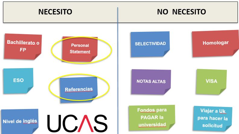 Hacer la solicitud fuera de España es complicado. FALSO. No en Reino Unido. Se hace on-line en http://www.ucas.com y solicitas 5 carreras de una sola vez. Solo necesitas tener a mano: notas de primero de bachillerato, notas de la ESO, una referencia de tu colegio y un Personal Statement (carta de presentación). Ven a la Feria de Educación para aprender a escribirlo! Eso sí, hay que hacerlo antes del 15 de enero.